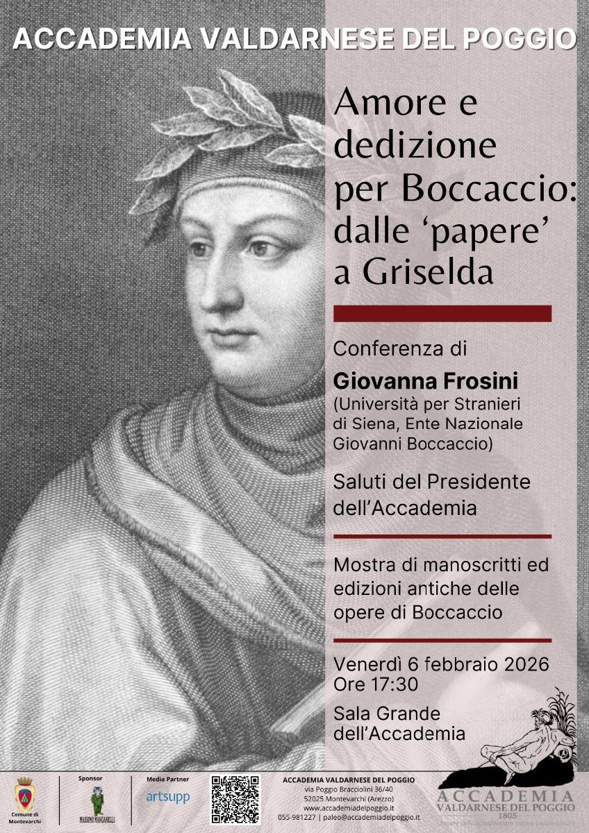 Il mese di febbraio, all’Accademia Valdarnese del Poggio di Montevarchi, inizia nel segno di Giovanni Boccaccio e del suo Decameron. Venerdì 6, alle 17:30 nella Sala Grande, Giovanna Frosini (Università per Stranieri di Siena, Ente Nazionale Giovanni Boccaccio) terrà una conferenza in cui avremo l’occasione di parlare di donne e d’amore, in un’epoca lontana ma anche nostra, grazie alla visione che Boccaccio ha dell’amore.